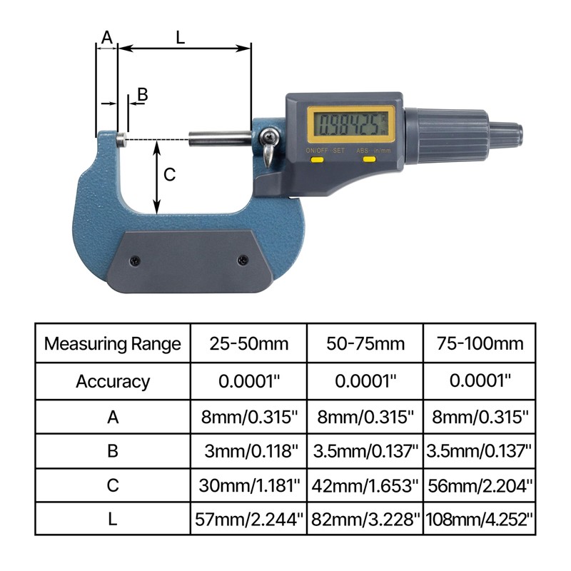 - [Wide Measuring Range]: Accurately measure with a range of 2-3"/50-75mm and a ratchet thimble for consistent readings. Achieve precise measurements with a graduation of 0.00005"/0.001mm and an accuracy of ±0.00012"/0.003mm.