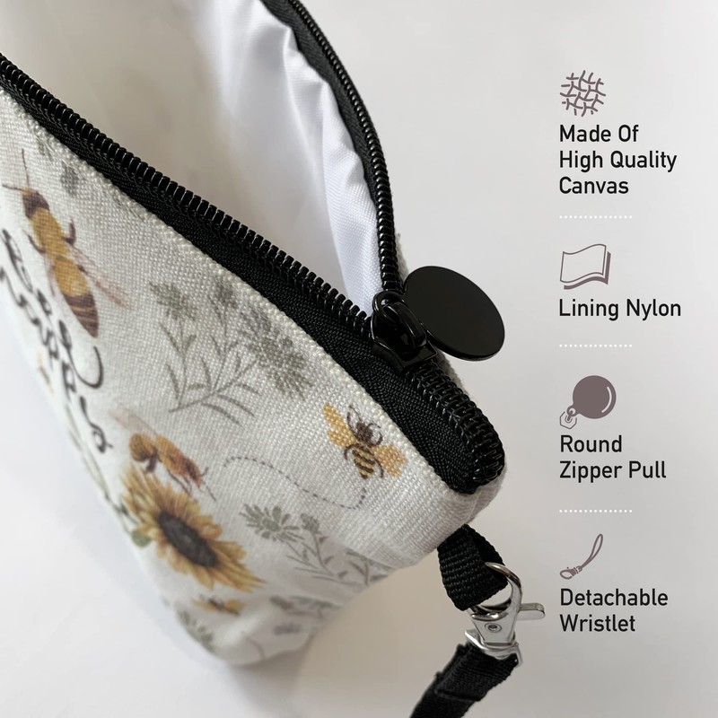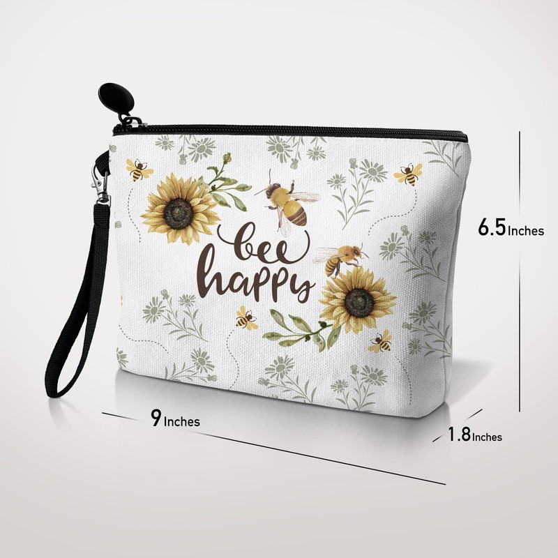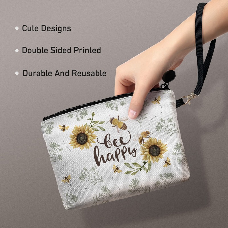 • 🌻【Bonito diseño y tema divertido】Bolsa de maquillaje Hglian Bee Happy para bolso diseñada con estampado de doble cara, cremalleras negras suaves confiables, correa de muñeca negra extraíble. Un esencial para todas las mujeres o niñas de moda.