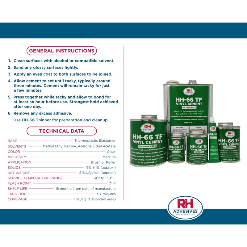 - Sturdy and Flexible – Our highly regarded HH-66 TF Vinyl Cement sets the industry standard for vinyl material repair, maintenance, and manufacture