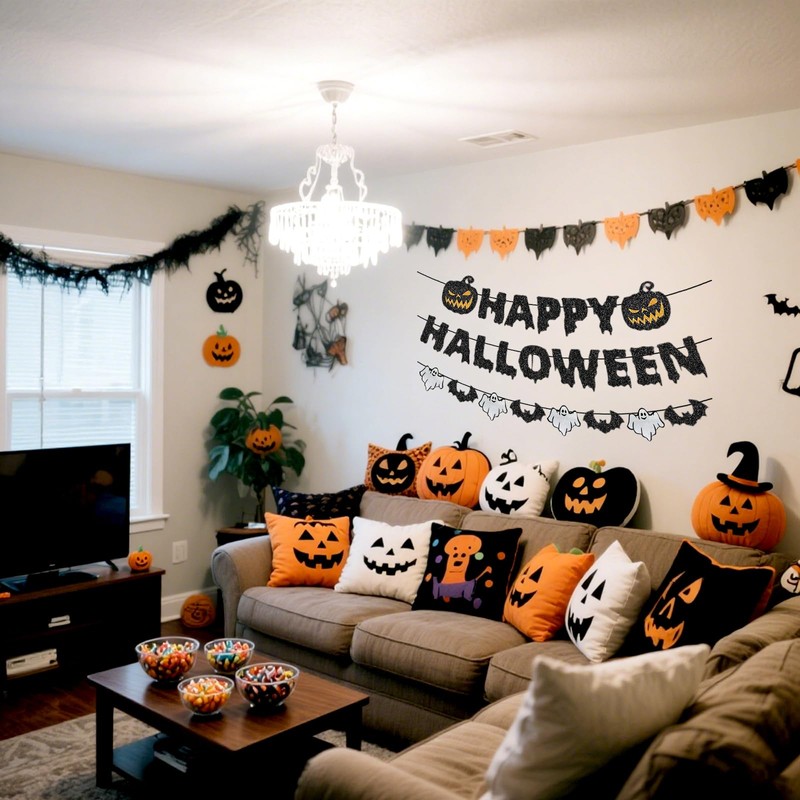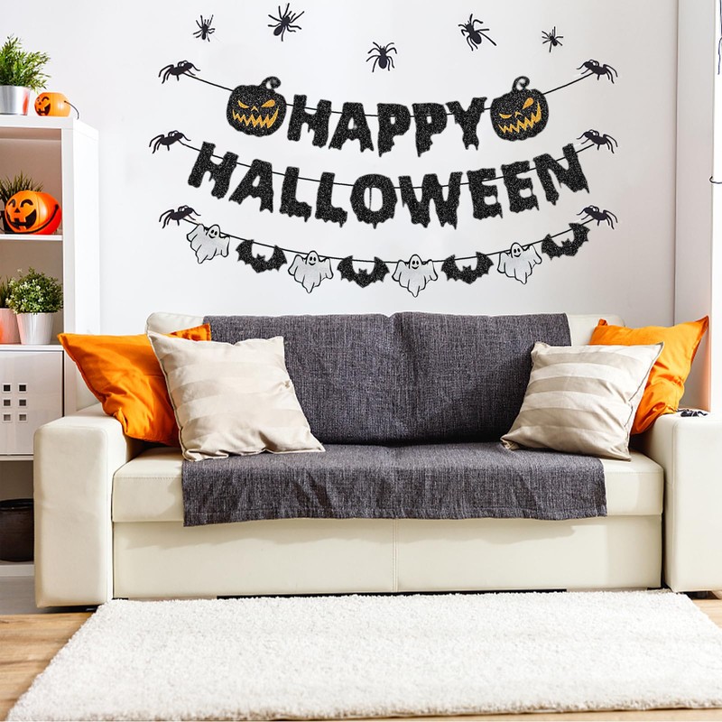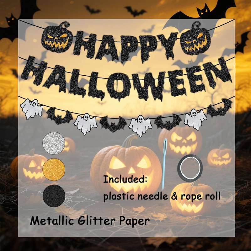 - Add a Spooky Sparkle:Bring your Halloween party to life with this high-quality "Happy Halloween" banner! Made from sturdy cardboard with bold black glitter lettering, it’s built to last through many spooky seasons. The dripping font and fun Halloween icons—like pumpkins, ghosts, and bats—add the perfect creepy-cute touch to your setup. Whether you're throwing a big bash or decorating your front porch for trick-or-treaters, this banner brings festive charm wherever it hangs. It comes pre-strung and ready to go, so all you have to do is hang it up and enjoy. Perfect for indoor or outdoor use, it’s a simple way to make your space feel Halloween-ready in minutes.