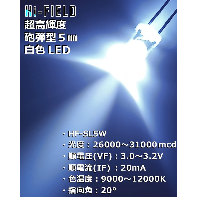 Hi-FIELD Ultra Bright LED White 31000mcd 20mA 20° Cannonball 5mm Light Emitting Diodes 10pcs