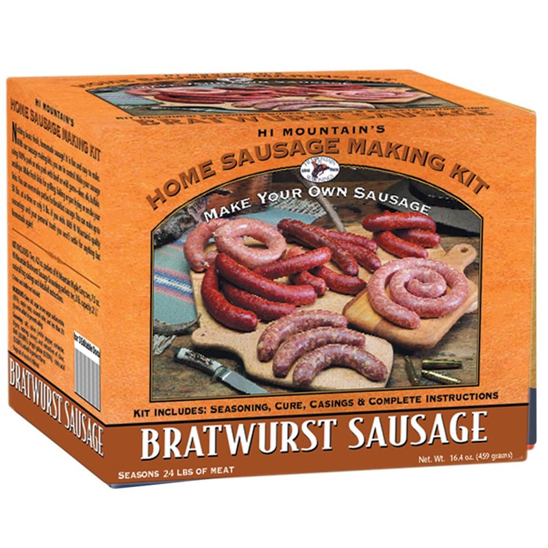Hi Mountain Seasonings ǀ BRATWURST Sausage Making Kit ǀ Includes Sausage Seasoning, Cure, Natural Hog Casings, and Simple-to-Follow Directions ǀ Creates 24 lbs of Delicious Bratwurst Sausage