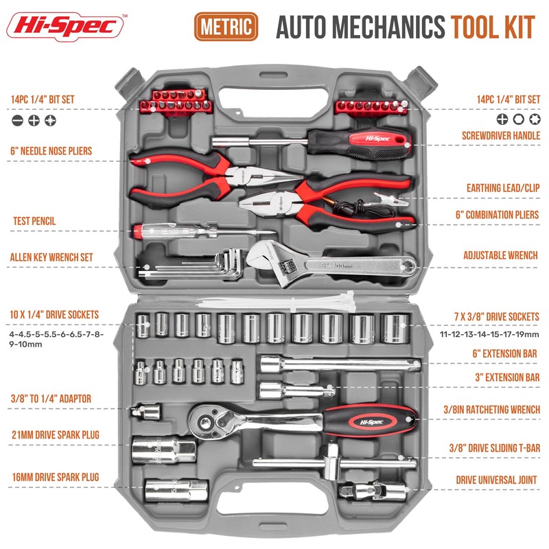 • AUTO TOOL KIT ON THE ROAD: Get prepared for essential vehicle repairs, maintenance and emergencies with the Hi-Spec Auto Mechanics Hand Tool Kit Set. Carried in a portable case for easy storage in the trunk or under a seat