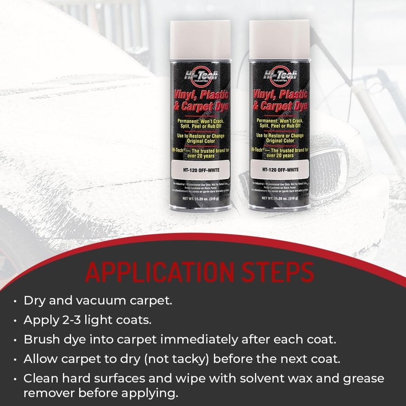 This is Professional grade refinisher formulated to protect and beautify interior and exterior surfaces. Perfect for Leather, Carpet, Vinyl, Metal, ABS Plastic, PVC, Polycarbonate, Polypropylene, Acrylic, Lexan, Fiberglass, and Recycled Plastics. Uses include Car Headliner, dashboard, steering wheels, seat, outdoor furniture, marine applications, couch, even shoe repair. Premium nozzle twists for both vertical and horizontal spray. Hi-Tech Automotive Dyes are VOC Complaint with UV enhanced stability. All dry times are based on 72 degrees F, 50 percent Humidity and 1. 5 Mil Thickness.