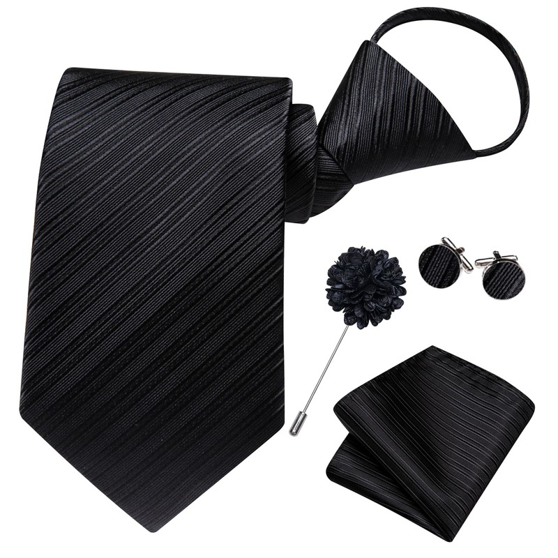 Hi-Tie Zipper Ties for Men Paisley Striped Plaid Adjustable Pre-tied Necktie Lapel Pin Pocket Square Cufflinks Set, Black B, Medium