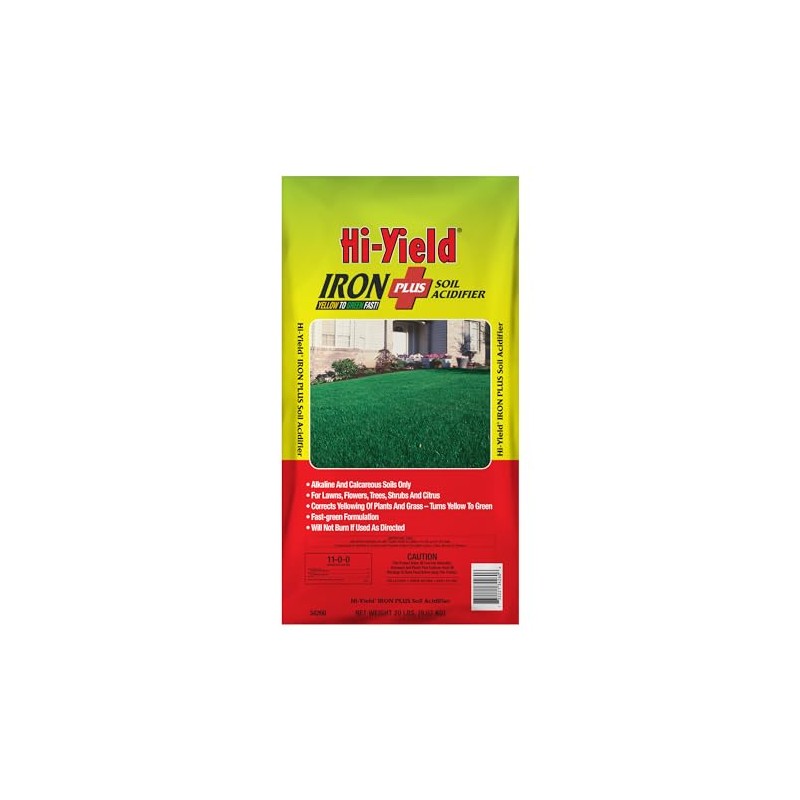 About Hi-Yield Iron Plus Soil Acidifier 11-0-0: Contains a pelletized material that will turn yellow plants and grasses green fast. Designed for Alkaline and Calcareous soils only. About Hi-Yield: Made by VPG Inc., in Bonham, Texas, USA, we have existed to strengthen, empower and support locally owned merchants.