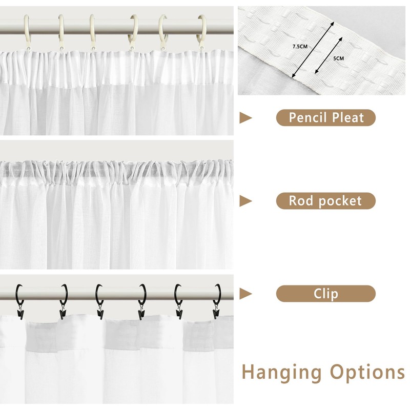 • Size: 160cm x 140cm (H x W). Quantity: 2 pieces in one pack. The linen look transparent curtains have a ruffle tape (7 cm high) at the top for easy installation and movement.
