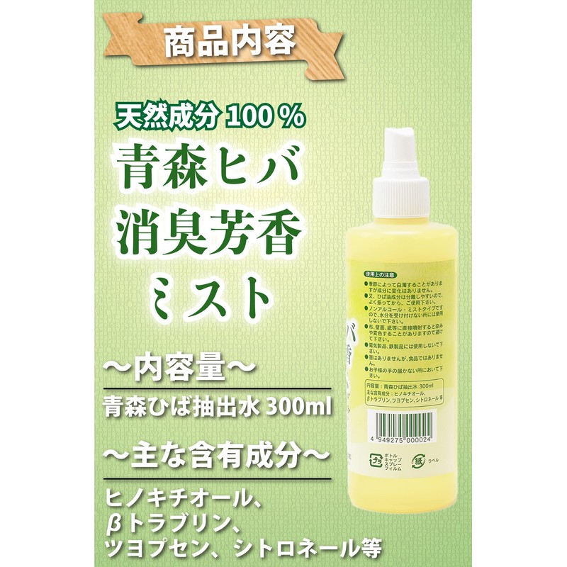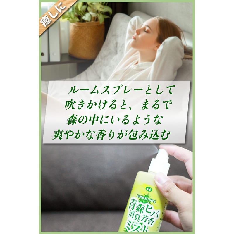 - This deodorizing spray is formulated with Hiba Aomori containing a wide variety of active substances including Hinokiol and Hiba