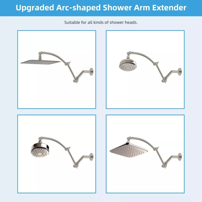 - 【16'' Upgraded Shower Extension Arm】 Height & angle adjustable arc-shaped design enhances its bearing capacity, high rise your shower head to achieve vertical water. Compared with the regular shower arm extender, the Hibbent shower arm extension can raise the shower head higher or lower and keep the shower head in a horizontal position all the way. The shower head is always vertical in your large size and will not hit the shower arm, instead of sloping water like an ordinary straight shower arm.