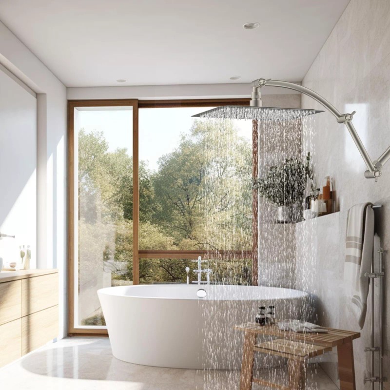 - 【Two Foot Vertical Movement Range】 Arc-shape designs to enhance its bearing capacity and high rise your shower head. Its swivel joints are tough and won't break or leak. The brass shower extension arm has a well-fortified jointed pivot that can support up to three pounds.