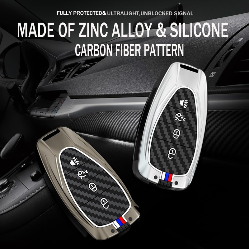 - 【Material & Design】:Zinc alloy shell is strong and durable;Carbon fiber texture pattern, fashionable and high-end; the 3D tactile silicone buttons are comfortable to press, soft, wear-resistant and dirt-resistant; the three red, white and blue lines on the key shell will emit fluorescence at night, Helps us find our keys quickly in total darkness (the light bar is made of fluorescent or phosphorescent materials, which needs to absorb energy from external light sources)