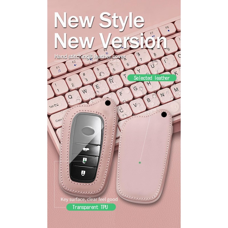 HIBEYO Smart Key Fob Cover Fit for Toyota Land Cruiser 4Runner RAV4 Camry Highlander Real Leather Key Case Shell Protector fit for Toyota Car Accessories Key Chain-A Keychain Pink