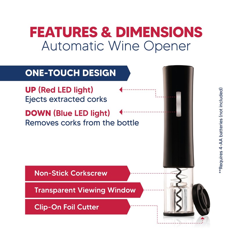 • Works with natural and synthetic corks; requires 4-AA batteries (not included); wipe clean