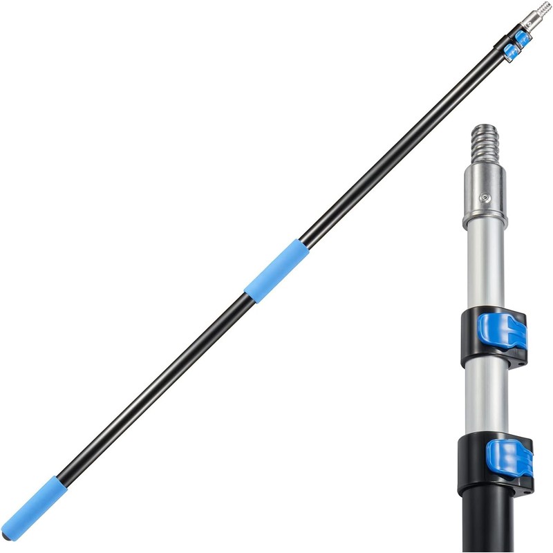 This telescopic paint roller extension pole is made of lightweight sturdy aluminum. It is tough and strong. Features easy flip-tab lock mechanism for adjusting to any custom length from 5 to 12 ft. Come with the Standard US threading twist-on metal tip. It can be used for paint roller, paint brush, squeegee, wasp spray, cobweb duster, ceiling fan duster, feather duster, fruit picker, high ceilings light bulb changer, window washing kit.