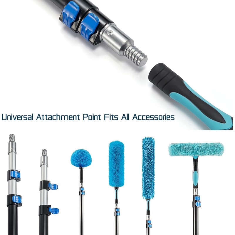 • 5.Multi-purpose use for paint roller, paint brush, squeegee, wasp spray, cobweb duster, ceiling fan duster, feather duster, fruit picker, high ceilings light bulb changer, window washing kit.(Attachments sold separately)