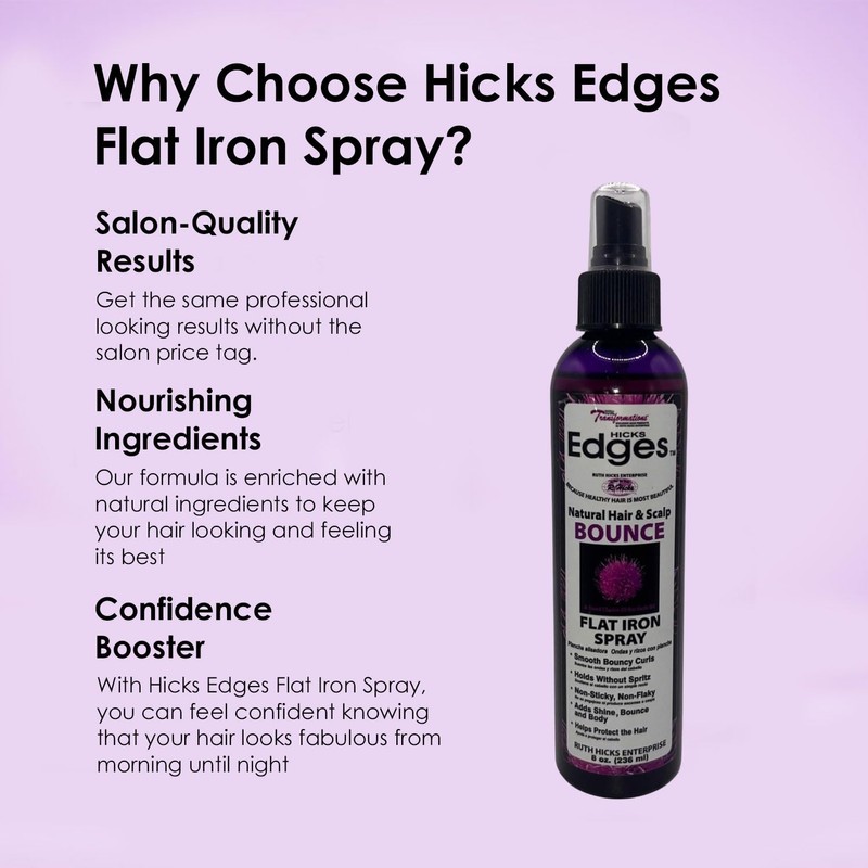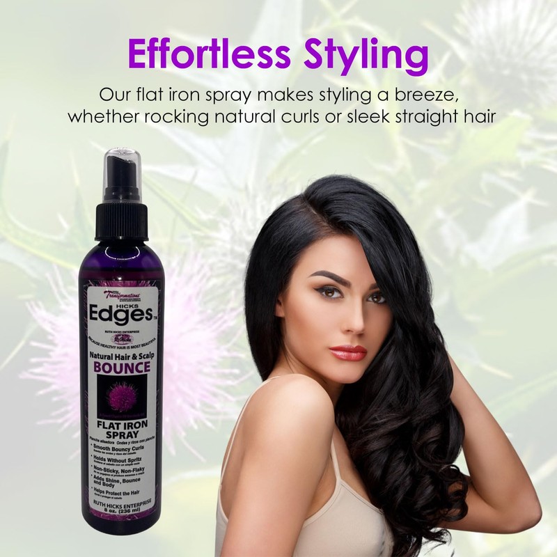 Hicks Edges Natural Hair and Scalp Bounce Flat Iron Spray, Smooth Bouncy Curls, Holds without Spritz with Heat Protection, Non-Sticky and Non Flaky, Adds Shine and Bounce, Help protect Hair
