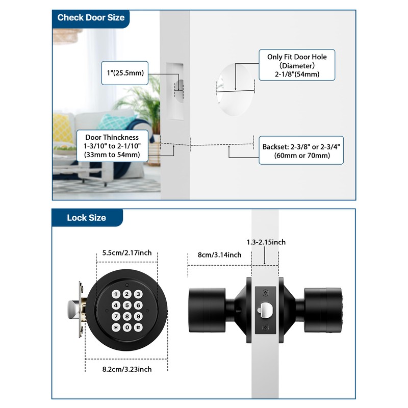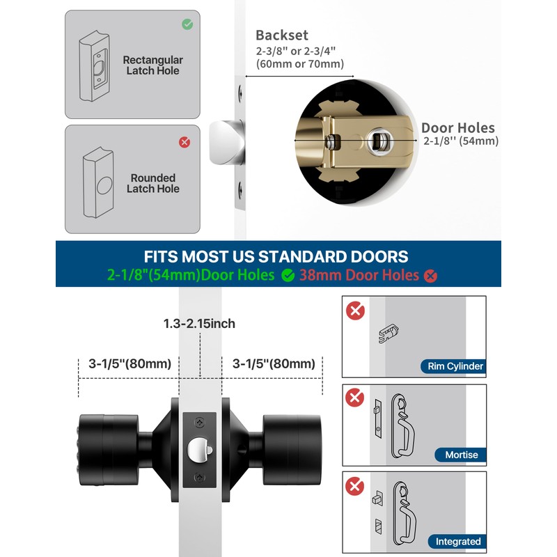 - Versatile Fit: Designed to fit most US standard doors, its adaptable knob suits both left and right-handed doors. The latch is adjustable to accommodate either 2-3/8-Inch (60mm) or 2-3/4-Inch (70mm) backset with 54mm door hole in diameter.
