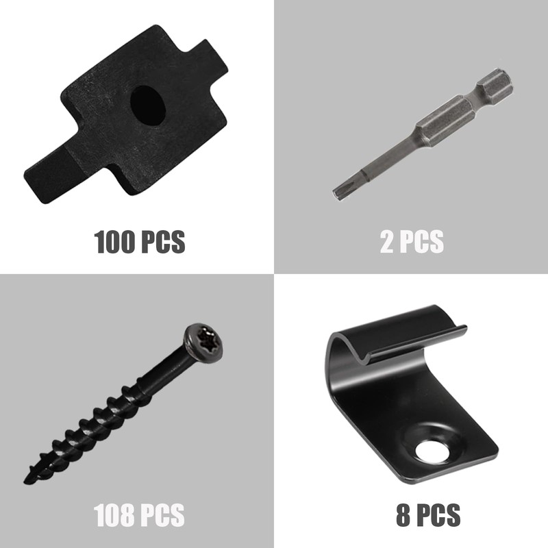 - 【You Will Get】Box with complete deck fastening kit,included 100pcs nylon hidden fastener clips,8pcs 304 stainless steel start deck clips,108 pcs stainless steel screws,2pcs drive bits.High quality fasten kit ensures you complete deck fixing smoothly
