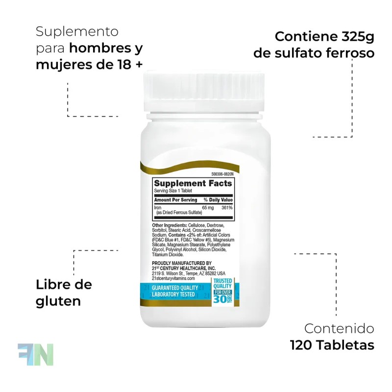 Hierro 65 Mg (sulfato De Hierro 325mg) 21st Century 120 Tabs Sabor N/a