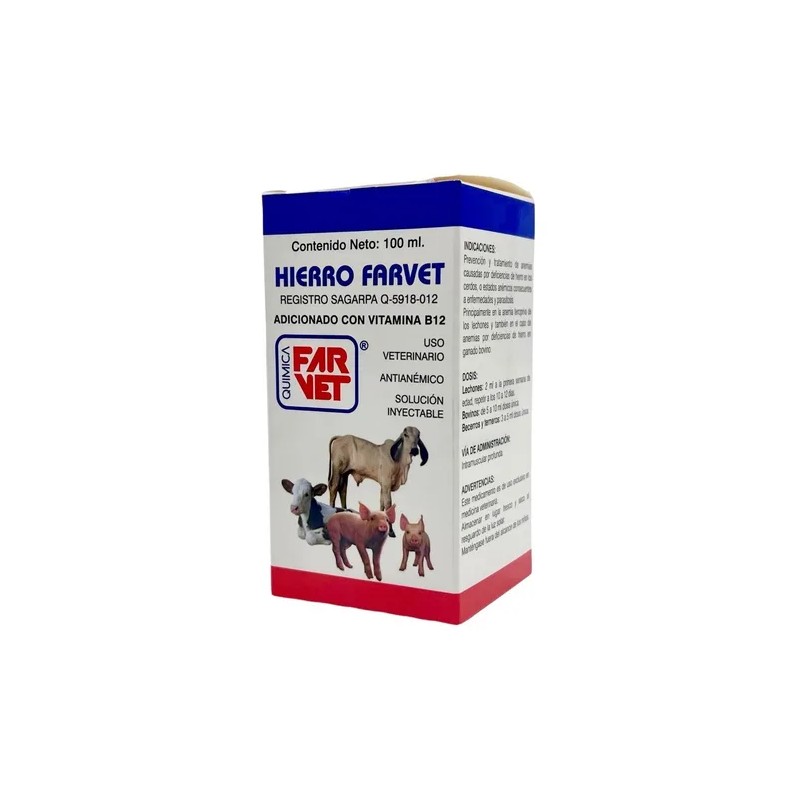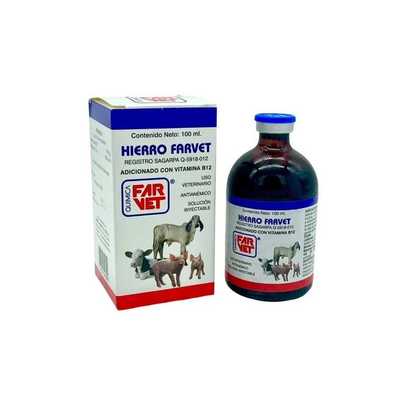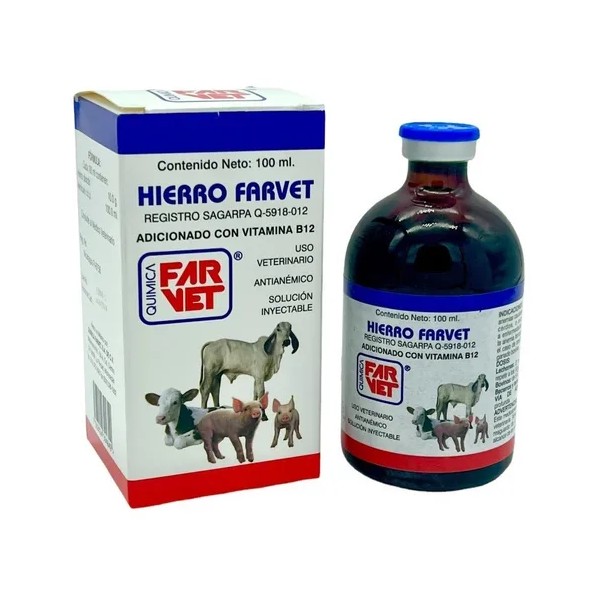 Hierro Farvet es una solución inyectable diseñada específicamente para animales, presentada en un práctico envase de 100 ml. Este producto de la reconocida marca Farvet se encuentra en condiciones nuevas, garantizando su eficacia y seguridad para el uso veterinario. La línea Hierro está formulada para proporcionar un suplemento esencial que ayuda a combatir la deficiencia de hierro en diversas especies animales. Su formato líquido facilita la administración, asegurando una rápida absorción y efectividad. Cada envase contiene una unidad, lo que lo hace ideal para tratamientos específicos. Con un volumen neto de 100 mL, Hierro Farvet es una opción confiable para mantener la salud y el bienestar de tus animales, asegurando que reciban el soporte nutricional que necesitan.