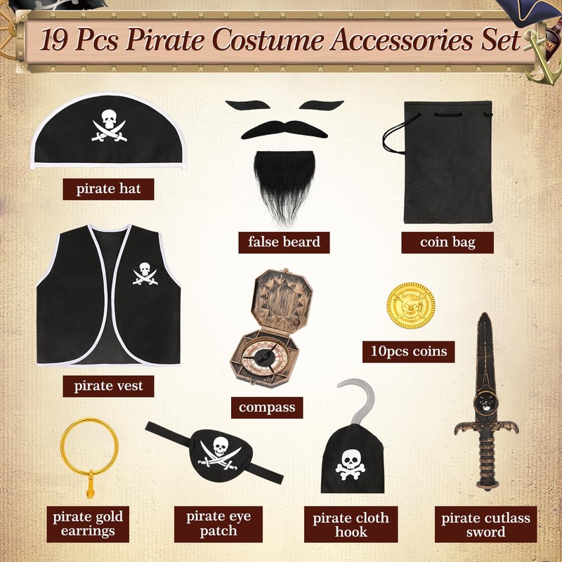 - Vollständiges Piratenkostüm: Dieses Piratenkostüm für Kinder beinhaltet eine Piratenweste, einen Piratenhut, ein Schwert, eine Augenklappe, Münzen, einen Kapitänshaken, falschen Bart und Kompass-Piratenaccessoires, was es zu einem kompletten Set für jede Piraten-Themenveranstaltung macht.