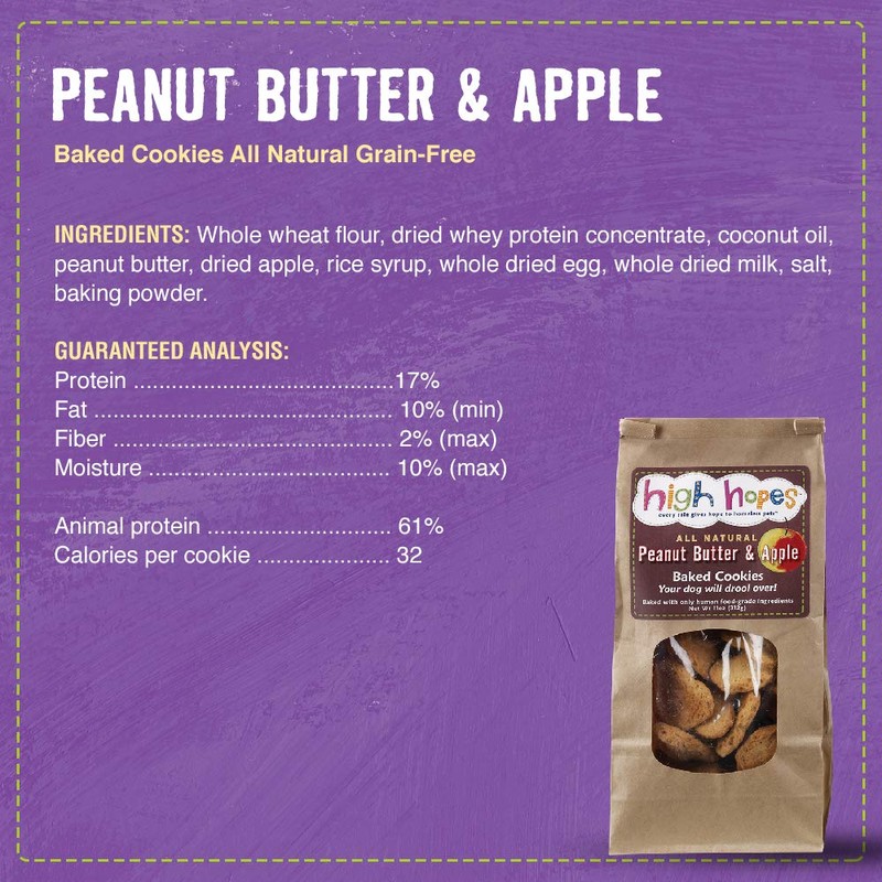 - DOG BISCUITS: Pack of two, 11 ounce bags of HIGH HOPES Peanut Butter and Apple Baked Cookies. Each bag contains all natural, healthy, whole-grain baked dog biscuits that will make your dog drool