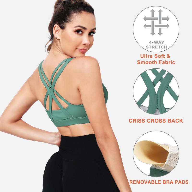 - HIGH SUPPORT DESIGN: DODOING high support sports bras for women feature an ergonomic criss cross back design, providing optimal shoulder freedom and enhanced stability during high-impact activities. The molded cup sports bra offer a secure fit with smooth shaping, providing adequate support---without restricting your movement or breath.