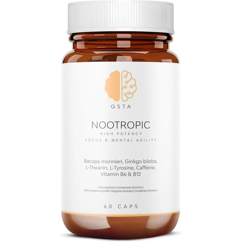 High-Potency Nootropic Supplement for Focus, Memory, and Mental Agility - Bacopa Monnieri, Ginkgo Biloba, Tyrosine, Theanine, Caffeine, B6 & B12