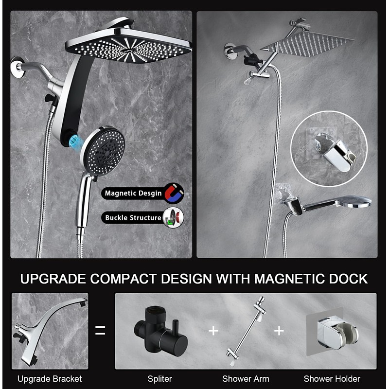 - Upgrade technology ensure amazing showering experience, compare with original magnetic shower head, our rain shower head adopts strong metal magnetic combin buckle structure which can hold your handheld shower head firmly (Patent NO:US011857983B2)