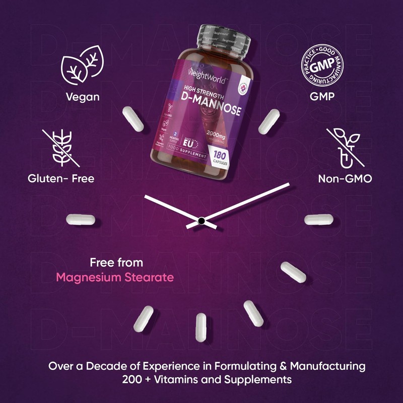 - WHY CHOOSE WEIGHTWORLD D MANNOSE?: Our D Mannose capsules are ideal for those looking for a high-quality & effective supplement. Each bottle of D-mannose supplement contains 180 vegan capsules, providing a 2-month supply. Each serving (3 capsules) contains 2000mg of pure and natural D-mannose, with 666mg expertly packed into every capsule. Our capsules are formulated to deliver optimal results. WeightWorld D mannose capsules (not D mannose tablets or D-mannose powder) are worth every penny.