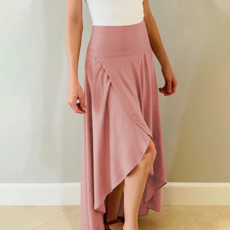 High Waisted Women's Skirts - Long, Flowing, Asymmetrical, Solid Ruffle, Slit, Wrap, Irregular Hem, Casual Maxi, A-Line Swing, Midi - Pink, XL