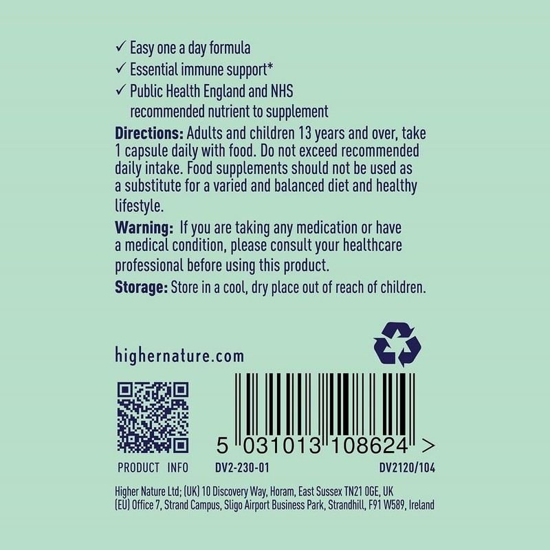 Product DescriptionHigher Nature Vitamin D 2000iu 120 CapsulesIngredientsSunflower seed oil, capsule (glycerine, modified starch, carrageenan), cholecalciferol (vitamin D3).DirectionsAdults and children 13 years and over, take 1 capsule a day with food. Do not exceed recommended daily intake. Food supplements should not be used as a substitute for a varied and balanced diet and healthy lifestyle.Safety WarningIf you are taking any medication or have a medical condition, please consult your healthcare professional before using this product.Manufacturer Contact InformationHigher Nature Ltd, 10 Discovery Way, Horam, East Sussex TN21 0GE, UK