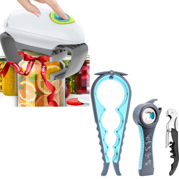 Higher Torque and One Touch Electric Jar Opener Easy Remove Almost Size Lid with Auto-Off, and Multi-Function Jar Bottle & Wine Opener Set for Weak Hands