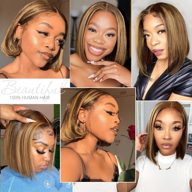 - Highlight 13x4 Frontal Bob Wig: 10A Brazilian Virgin Human Hair Bob Lace Front Wigs, Natural and Healthy, Soft and Bouncy, No Bad Smell, No Shedding and Tangle Free, zero Split Ends, 150% Density Highlight Bob Wig Ombre Short Bob Wig