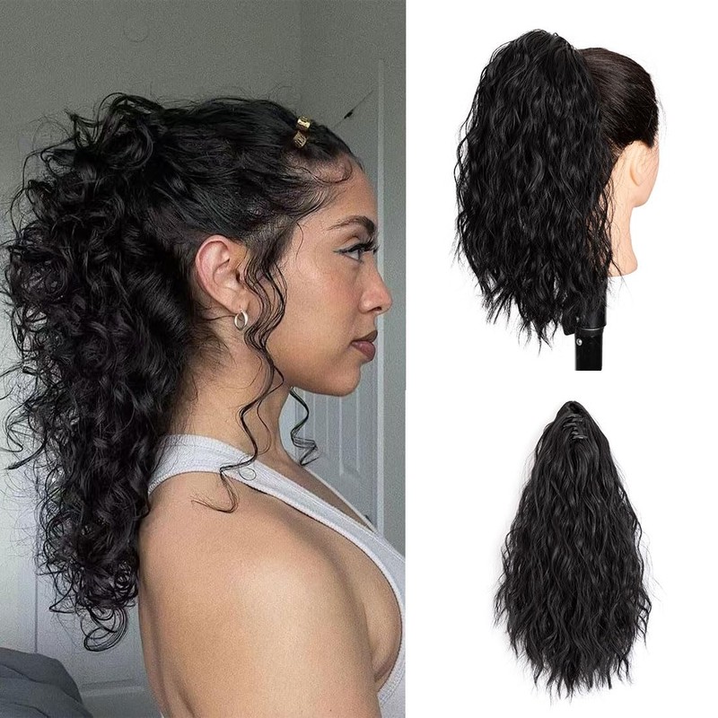 Highlight Ponytail Extension Claw Bun Hair Piece Elastic Drawstring Synthetic Ponytail Extension Hair Bun Extension for Women (Natural Black, 35cm Curly)