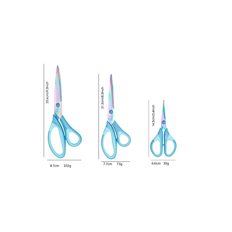- THREE SIZES SEWING SCISSORS - Titanium sewing scissors set of 3 include 236 mm (9.3 inch ) Dressmaking Scissors, 213 mm (8.4 inch) Craft Scissors, 143mm (5.5 inch) Embroidery Hobby Scissors, great for all your cutting needs in your daily life.