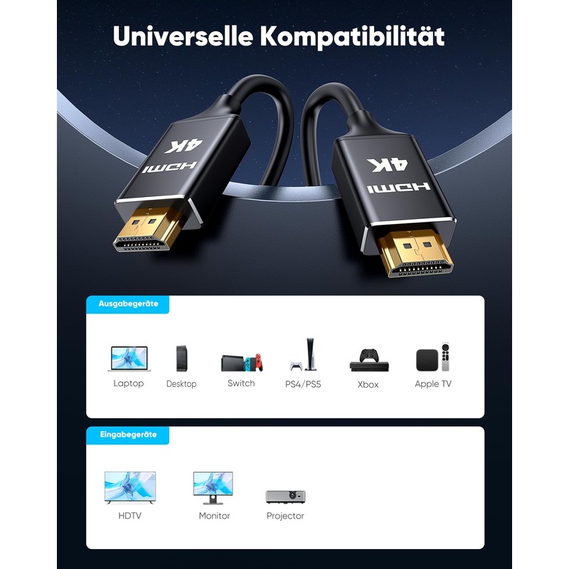 - Amazing visual experience: HDMI cable designed for TV enthusiasts. Innovative and improved 4K HDMI cable, 4K x 2K Ultra HD technology, resolution up to 3840 x 2160 @ 30 Hz, supports 4K video including 3D and multi-view video. Full HD, 1080p, HDR, enjoy full HD crystal clear TV sound quality and experience deep colours and high-resolution images for the best visual experience in Ultra HD