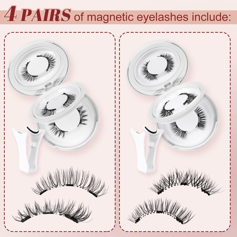 • MAGNETIC EYELASH KIT: The magnetic eyelash kit includes 4 pairs of magnetic eyelashes, 2 magnetic applicators, 2 small magnetic box with mirror and one instruction sheet.Magnetic eyelashes are easy to operate and only take 1 minute to complete, effectively saving your makeup time and allowing you to stayed on through an entire sweaty rave!