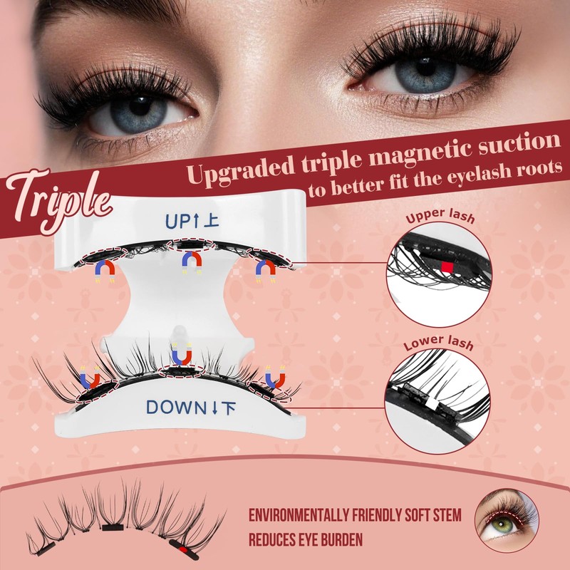 • NO GLUE OR EYELINER REQUIRED: Our upgraded magnetic eyelashes technology provides a comfortable wearing experience for people with sensitive eyes. Say goodbye to the mess of glue for beginners with our magnetic eyelashes. The magnetic design ensures a secure fit without the need for lash glue, so you don't have to worry about your eyelashes falling off! And it can be easily matched with any cosmetics without eyeliner, specially designed for lazy people!