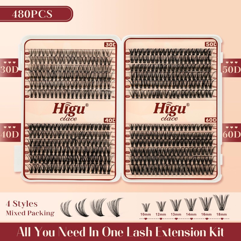 - 480PCS Wimpern-Extensions: Die einzelnen Wimpern von Higu Clace umfassen 480PCS 30D+40D+50D+60D Wimpernbüschel. 4 Wimpern Cluster in gemischten Stilen können Ihren Make-up-Anforderungen gerecht werden. Jede Wimperndichte hat ihre eigenen Eigenschaften. Ob leichtes oder starkes Make-up, es stehen Einzelwimpern zur Auswahl.