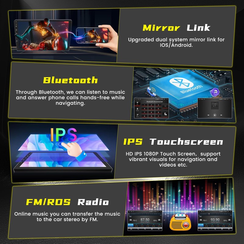 - 【Wireless Carplay & Android Auto】By connecting to the touch screen radio via Bluetooth or original USB cable, you can easily access to almost all the functions on your phone through the radio touch screen, like music, GPS navigation, calls, messages etc, more convenient. (Carplay via APP CPLink which already installed on the car radio)