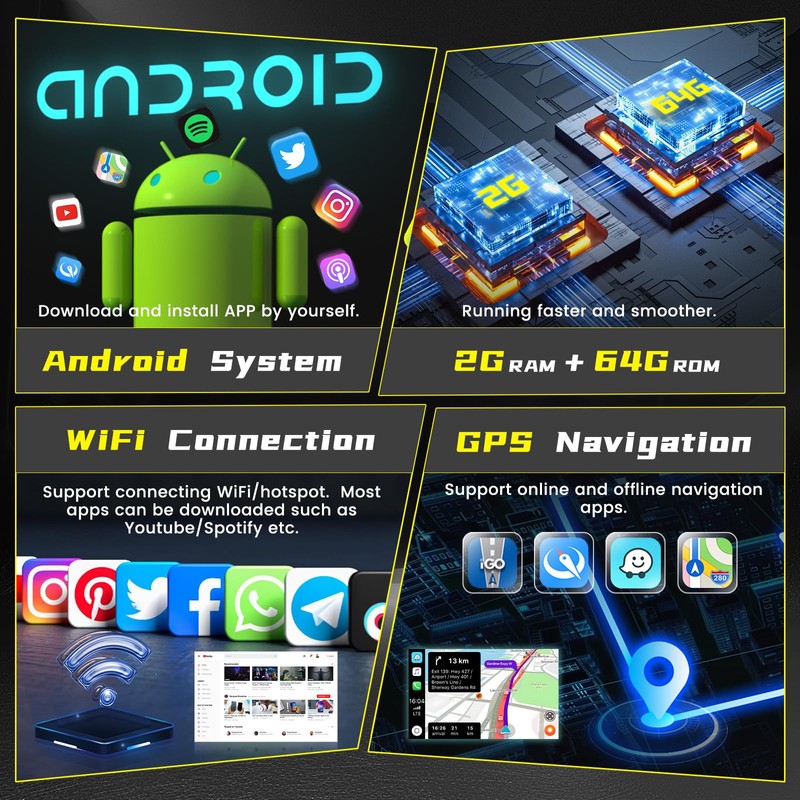 - 【Powerful Processor】The Latest Android system provide you with a smarter and more efficient services. 2G RAM ensures that the car radio runs smoothly, and 64G ROM allows you to download and install multiple apps that you like through the store, like Youtube, Navigation APP, etc. Equipped with a 9-inch HD capacitive IPS touchscreen, which is smoother and more responsive. Resolution is 1024*600 and support 1080p video playback