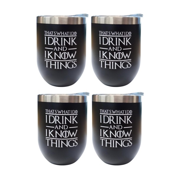 Hilarious 12oz Stainless Steel Vacuum Insulated Wine Tumblers with Press In and Slide Locking Lid For Wine Coffee Soda Cute Funny Mothers Cup (I Drink And I Know Things - Four Pack, 12 Ounce)