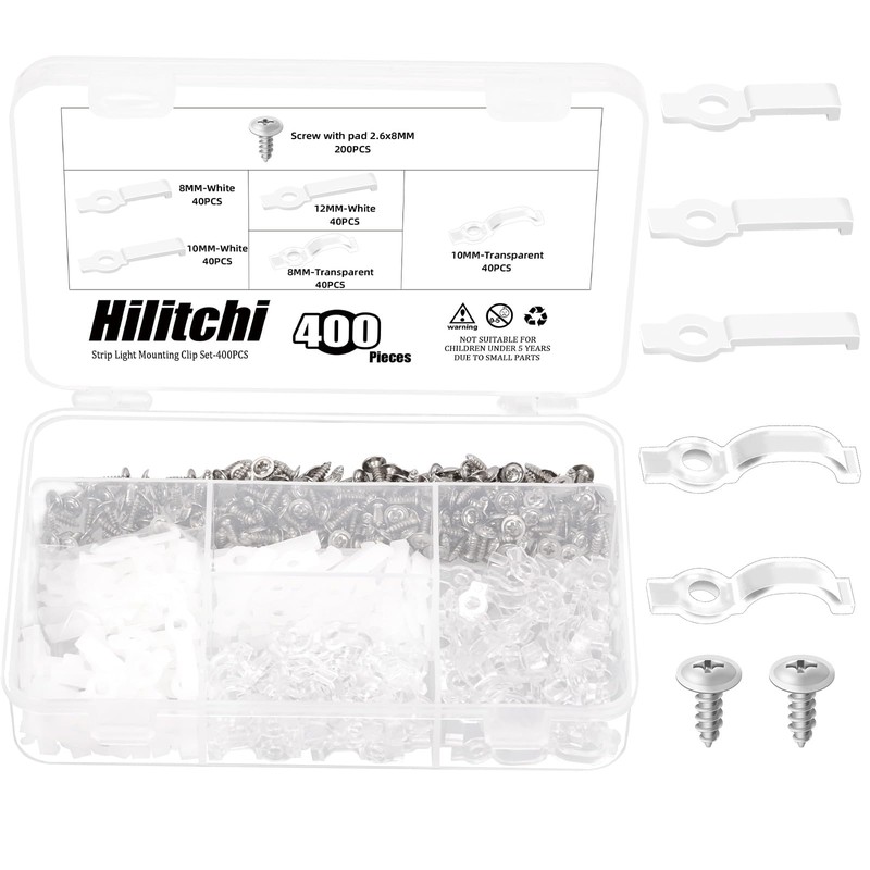 - ➹【What You Will Get】You will get 400pcs strip light mounting bracket, including 3 sizes (8mm 10mm 12mm) of white clips and 2 sizes (8mm 10mm) of transparent clips, 40pcs per size; as well as 200pcs screws with pad. Rich size and sufficient quantity can meet your daily needs.