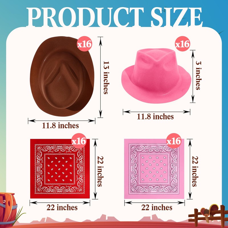 - Package Includes: you will receive 18 brown cowboy hats, 18 pink cowgirl hats, 18 red paisley bandanas, and 18 pink paisley bandanas, plenty for your daily use and decorative needs, this cowboy hat and bandana fits most style and personality, and it can make your child stand out from the crowd