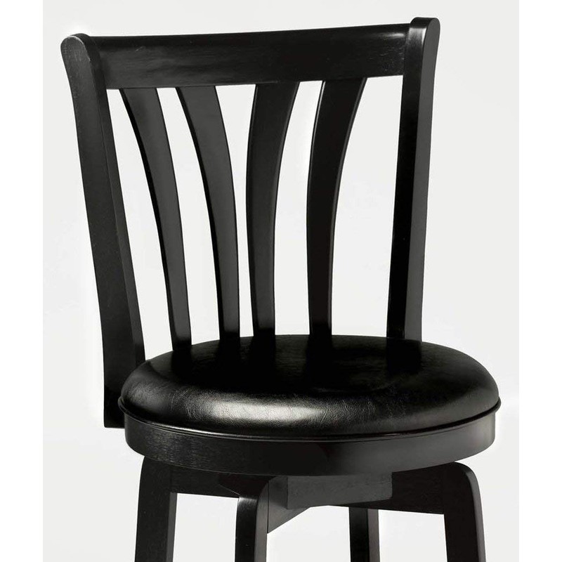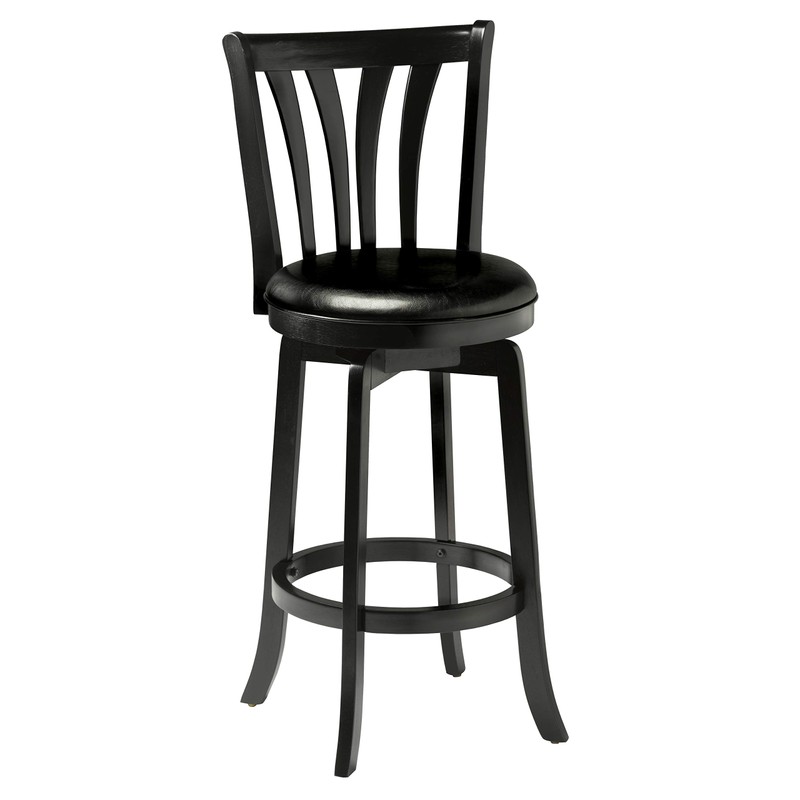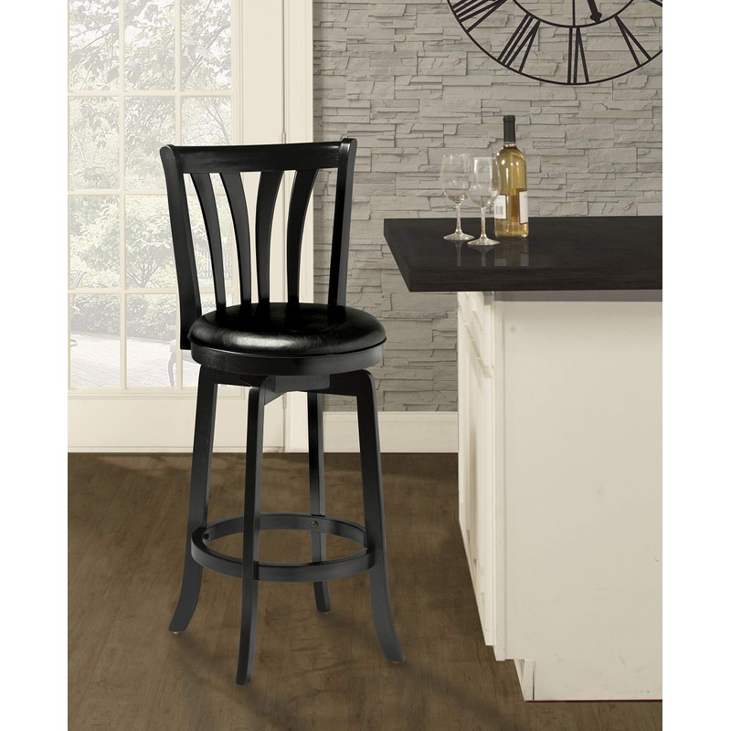 The Hillsdale Savana Swivel Counter Stool has a sturdy base with flared legs. The back has an arched spindle design and the seat is covered in easy to care for black vinyl. Finished in a simple black finish and constructed of hardwood, the Savana stool is a fantastic addition to any kitchen or home bar area. Assembly required.
