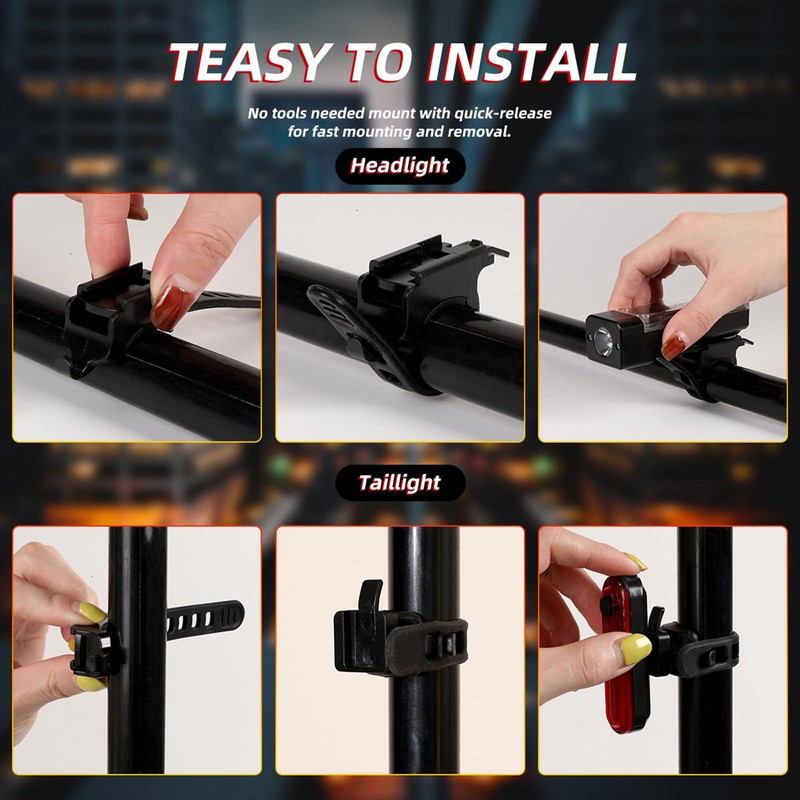 - Easy Installation & Usage: Both the bicycle front light and tail light come with a mount bracket, allowing for easy installation without the need for any other tools. Thanks to their compact, lightweight and sturdy design, you can install and detach them within 1 minute with ease. The mount brackets are universally compatible with various types of bikes such as mountain bikes, children's bikes, road bikes, as well as cars, electric bikes, racing bikes, folding bikes, bicycles, or even backpacks.
