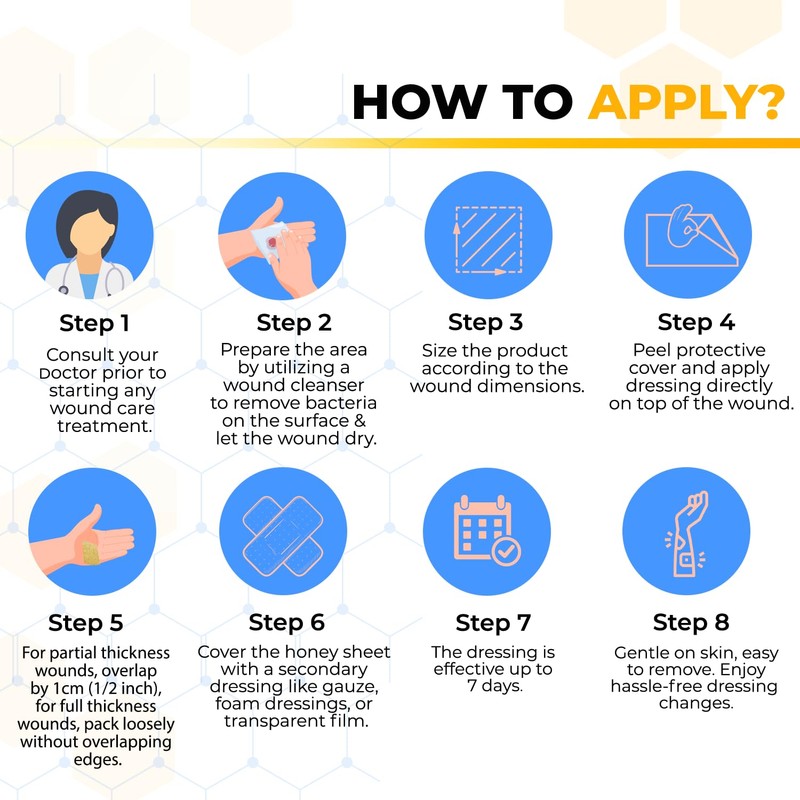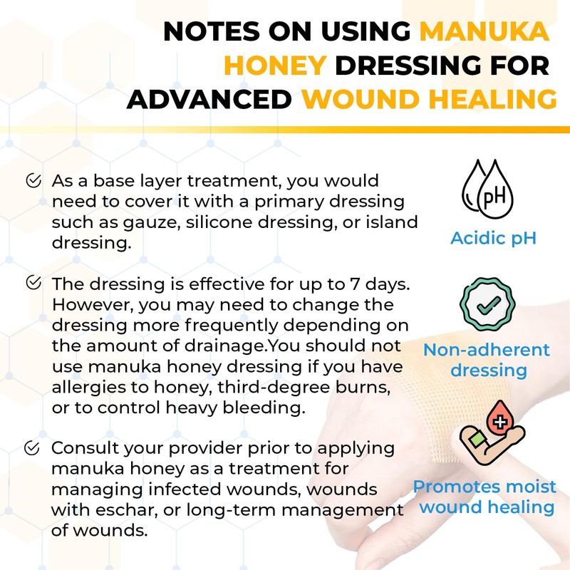 - ADVANCED WOUND CARE TECHNIQUE: The use of Manuka honey patches for wound healing promotes an optimal moist environment. This is achieved through the osmotic effect of sugar in wounds. Osmosis reduces swelling, encourages the flow of lymph fluid, and removal of dead tissue.