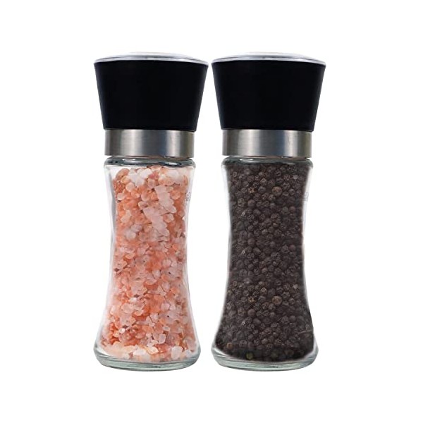 - HIGH QUALITY GLASS GRINDER: Salt and pepper grinder set feature a modern design and look classy and graceful enough for kitchen-to-table use. Salt and pepper grinder holds 100% Himalayan salt and black peppercorns