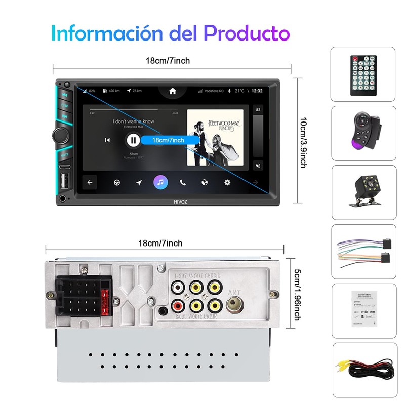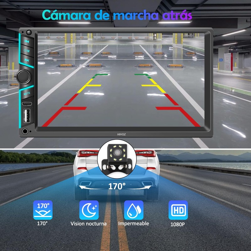 - 【Cámara de Marcha Atrás HD】: Autoestereo esta equipada con una camara de vision trasera gratuita que admite vision nocturna de alta definicion, una perspectiva super ancha de 170° y un diseno impermeable completamente.Cuando de automovil entra en la marcha atras, cambia automaticamente a la imagen de marcha atras y se puede ajustar el angulo de la camara a voluntad para garantizar una marcha atras segura.